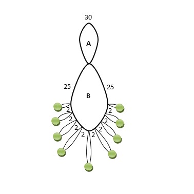 Z frywolitkowych wachlarzy zrobiłam dwukolorowe kolczyki dla koleżanki z pracy. A tu poniżej znajdziesz schemat graficzny frywolitkowych wachlarzy. Liczby określają ilość supełków pomiędzy konkretnymi fragmentami, a zielone kuleczki symbolizują koraliki. Miłego frywolitkowania