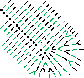 Rządek pierwszy to same oczka łańcuszka. Pozostałe przerabia się półsłupkami. Czyli: pełne kółeczka oznaczają oczko łańcuszka, proste krezki oznaczają półsłupki, dwie proste krezki ułożone w literę „V” oznaczają dwa półsłupki zrobione w jednym oczku z poprzedniego rzędu, a puste kółeczko oznacza oczko ścisłe.